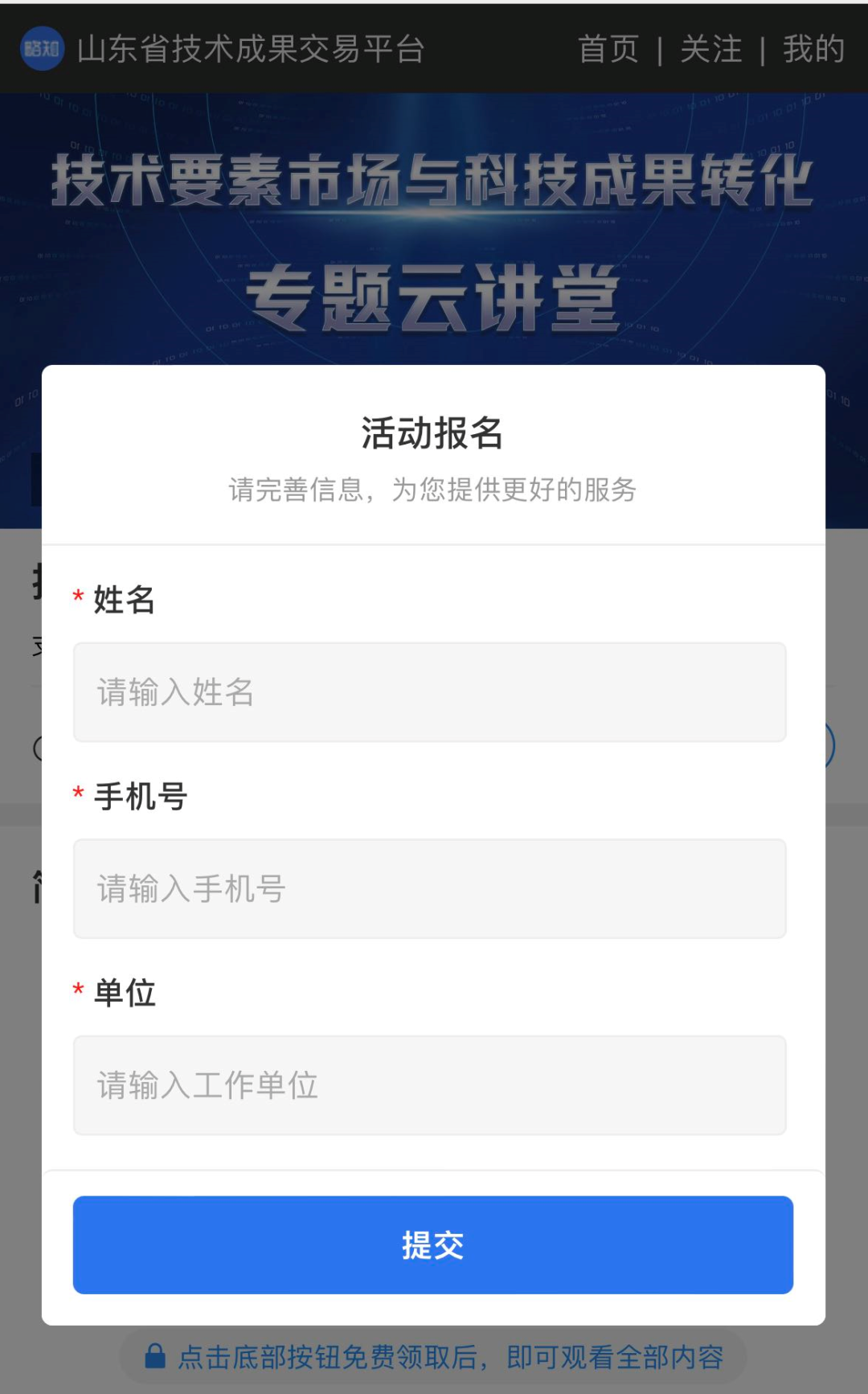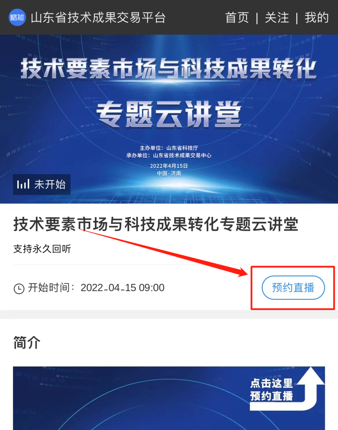 本次活动以山东省技术成果交易中心新上线运营的综合服务平台为依托,采取线上直播的方式,可扫描二维码关注预约直播,预约步骤如下: