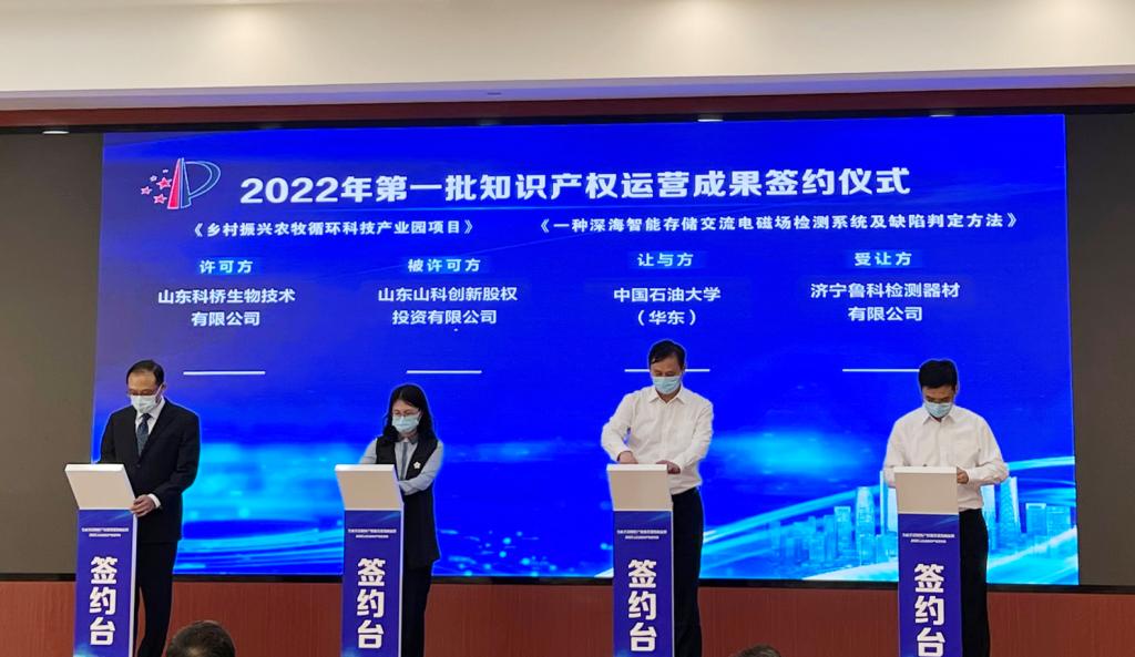 山东知识产权宣传周启动仪式采取线上线下相结合的方式举行,活动现场展示了山东省2022年第一批知识产权运营成果,360余项知识产权达成转让意向,总计转让金额超1.5亿元;组织了包括我校项目在内的6个具有代表性的科技成果转化及知识产权运营成交项目集中签约,涉及专利23项,成交金额3500万元。