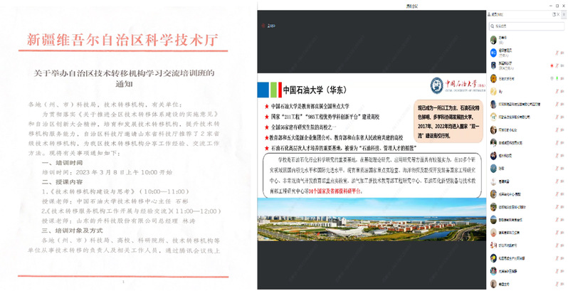 为推动学校与行业企业之间学习交流,新疆维吾尔自治区科技厅、山东省科技厅联合举办新疆维吾尔自治区技术转移机构学习交流活动,学校国家大学科技园办公室技术转移中心作为山东省科技厅唯一推荐高校技术转移机构代表做典型经验介绍并推介学校科技成果,新疆维吾尔自治区各地(州、市)科技局、技术转移机构参加交流活动。通过两省市之间对接交流实现科技创新为产业发展赋能,为地方经济发展引进更多的创新切入点,为学校争取更多资源支持。