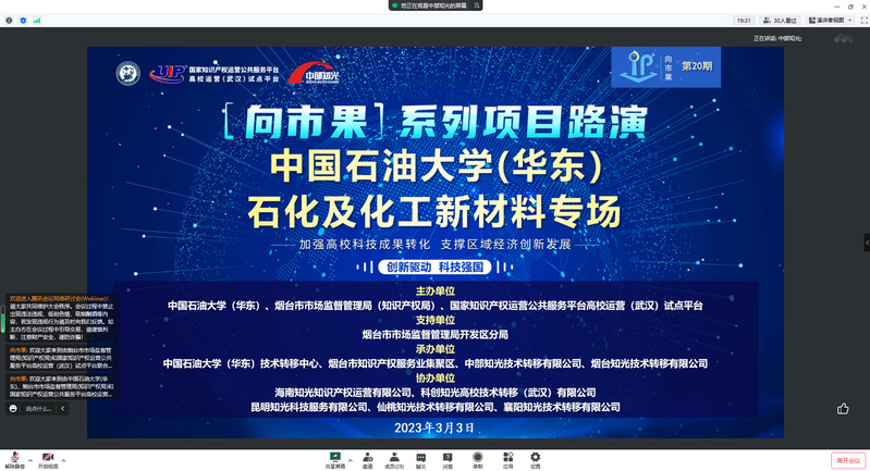 为更好地将科技成果与技术升级换代和企业需求对接,架起高校院所与市场、资本之间的桥梁,学校联合烟台市市场监督管理局、中部知光技术转移有限公司举办“向市果”必赢3003no1线路检测中心(华东)专场线上成果推介活动, 学校相关优质科技成果进行了线上推介,来自烟台市石油石化相关产业科技型企业管理人员、研发人员及相关工作人员,高校院所相关科研团队、地方政府、投资机构、科技服务机构近百人线上参会交流。