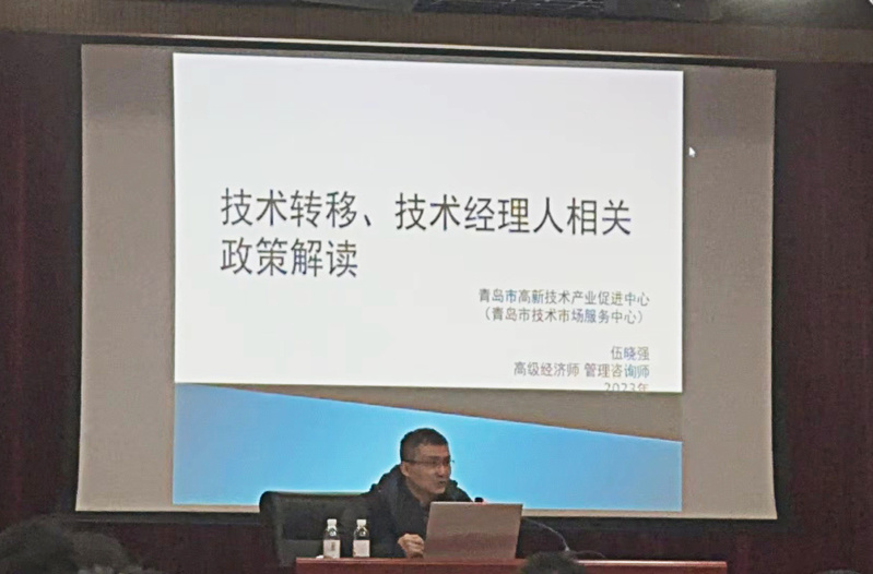 青岛市政协委员、青岛市高新技术产业促进中心高级经济师伍晓强为研修班学院带来第一课,为石大师生解读梳理国家省市转移转化政策,聚焦技术市场、技术合同着力补足学员前端知识。