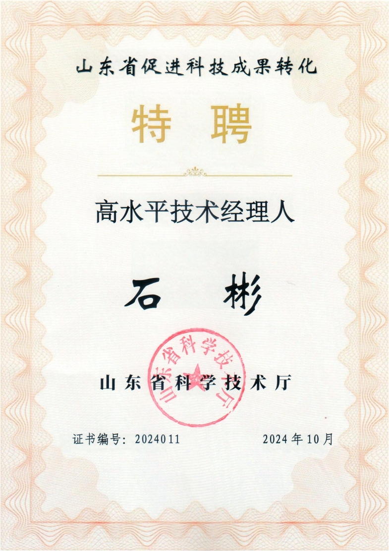 会上,学校国家大学科技园办公室技术转移中心主任石彬与来自中科院、山东大学、中部知光技术转移有限公司等10位为山东省技术转移工作作出突出贡献的技术经理人被山东省科技厅聘为山东省高水平技术经理人。