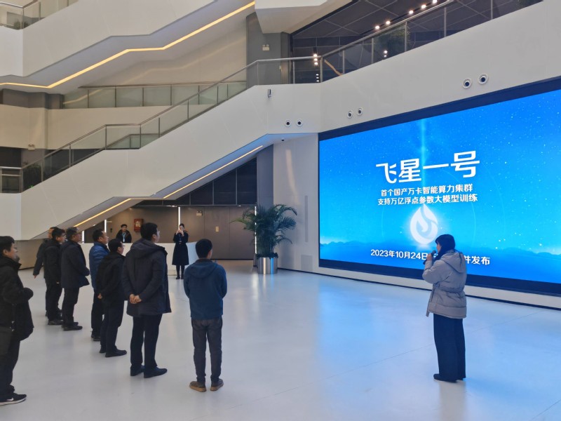 调研期间,学校一行参观科大讯飞首个国产万卡智能算力集群支持万亿浮点参数大模型以及人工智能展厅和大数据展示中心,深度体验科大讯飞在人工智能领域的核心技术和覆盖多个行业的智能产品和服务,以及科大讯飞在人工智能大模型方面的最新产品和成果。
