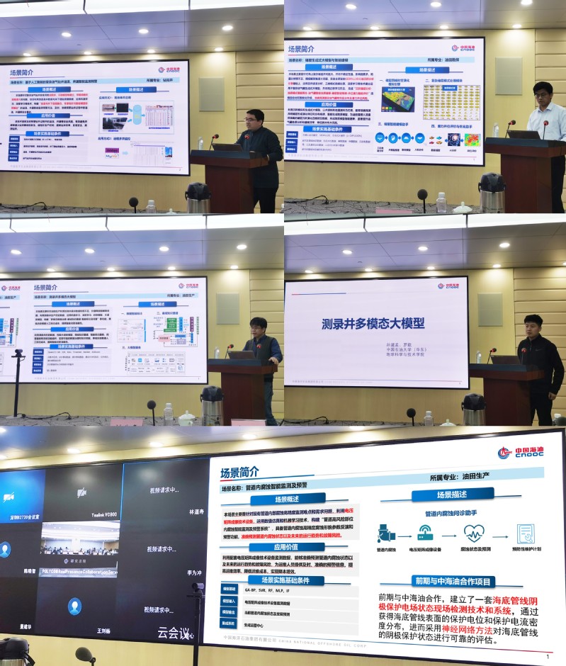 会上,学校专家教师携测录井多模态大模型、储层生成式大模型、管道内腐蚀智能监测及预警、基于人工智能的复杂油气钻井溢流井漏智能监测预警、P&ID图纸智能识别与重绘等勘探开发领域人工智能场景相关科技成果进行现场推介发布与推介,并与中海油集团相关职能部门专家就技术问题展开热烈讨论。